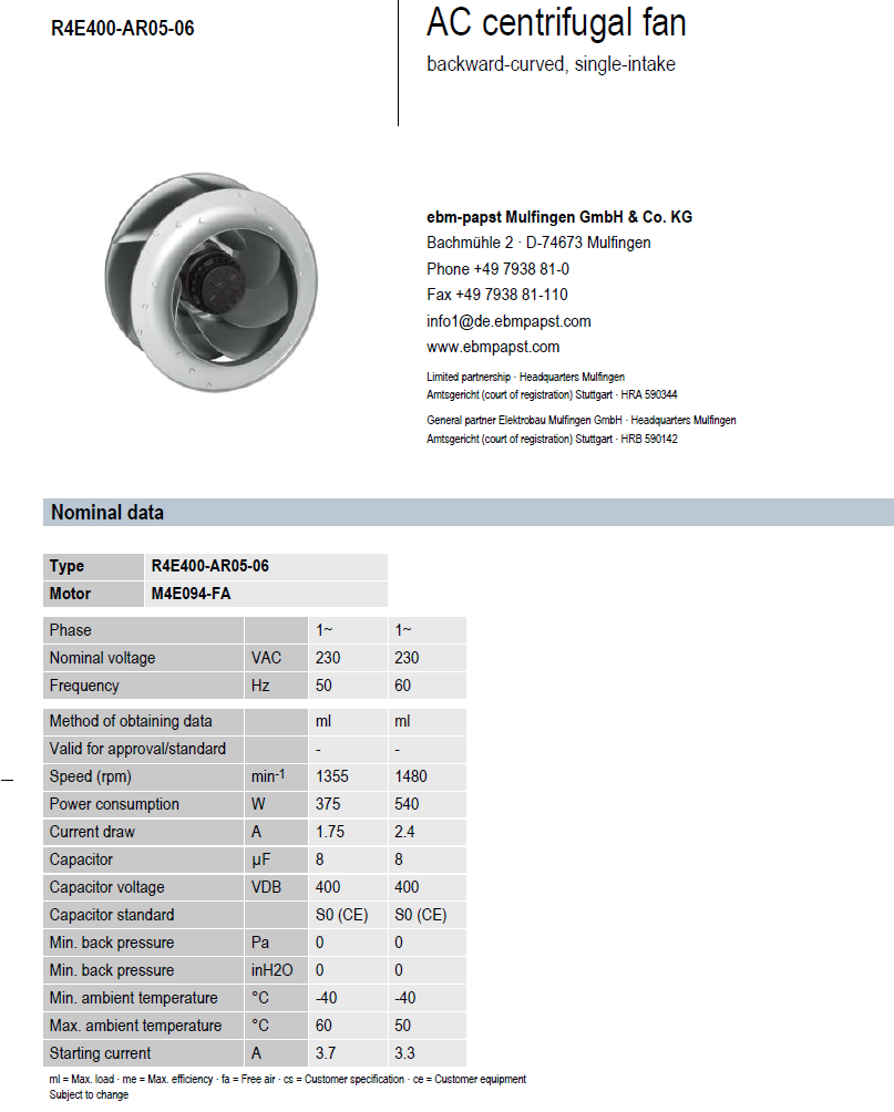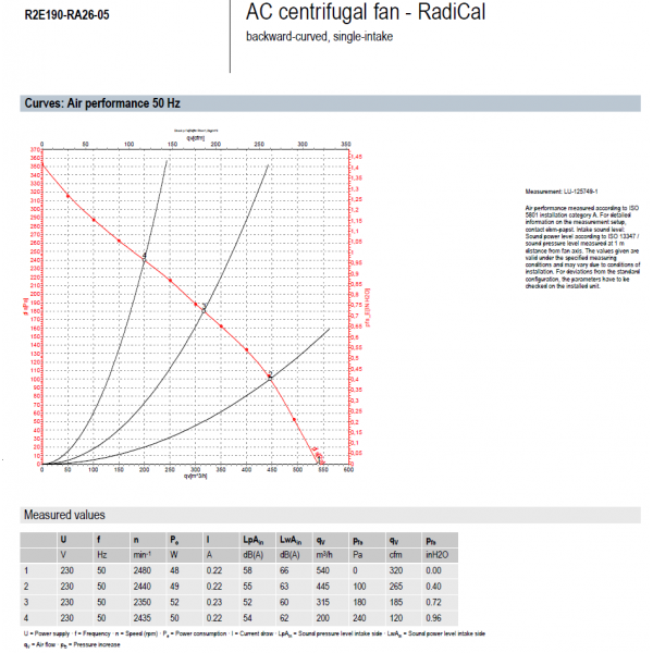 Lưu lượng tối đa: 540 m3/h @ 0 Pa
