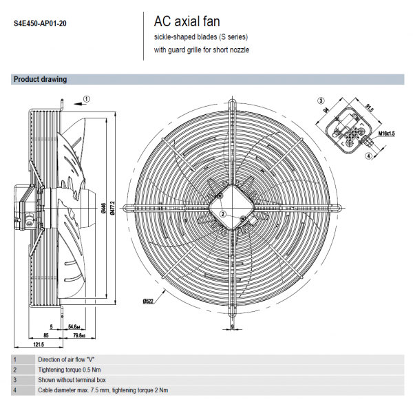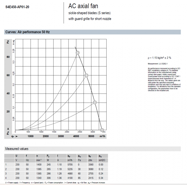Lưu lượng tối đa: 5705 m3/h @ 0 Pa @ max. 84 Pa